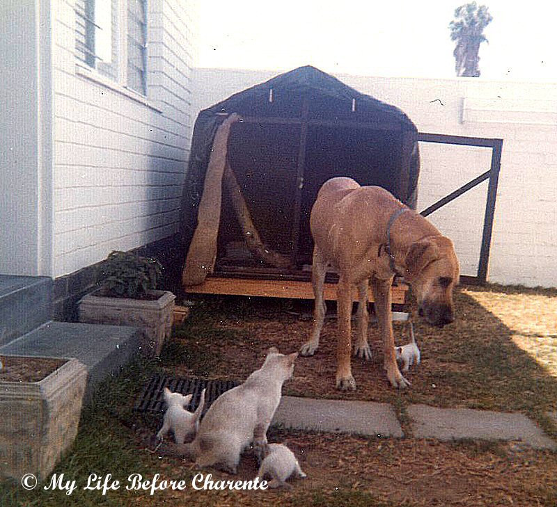 Rocky, my great dane, taking care not to step on the tiny kittens!